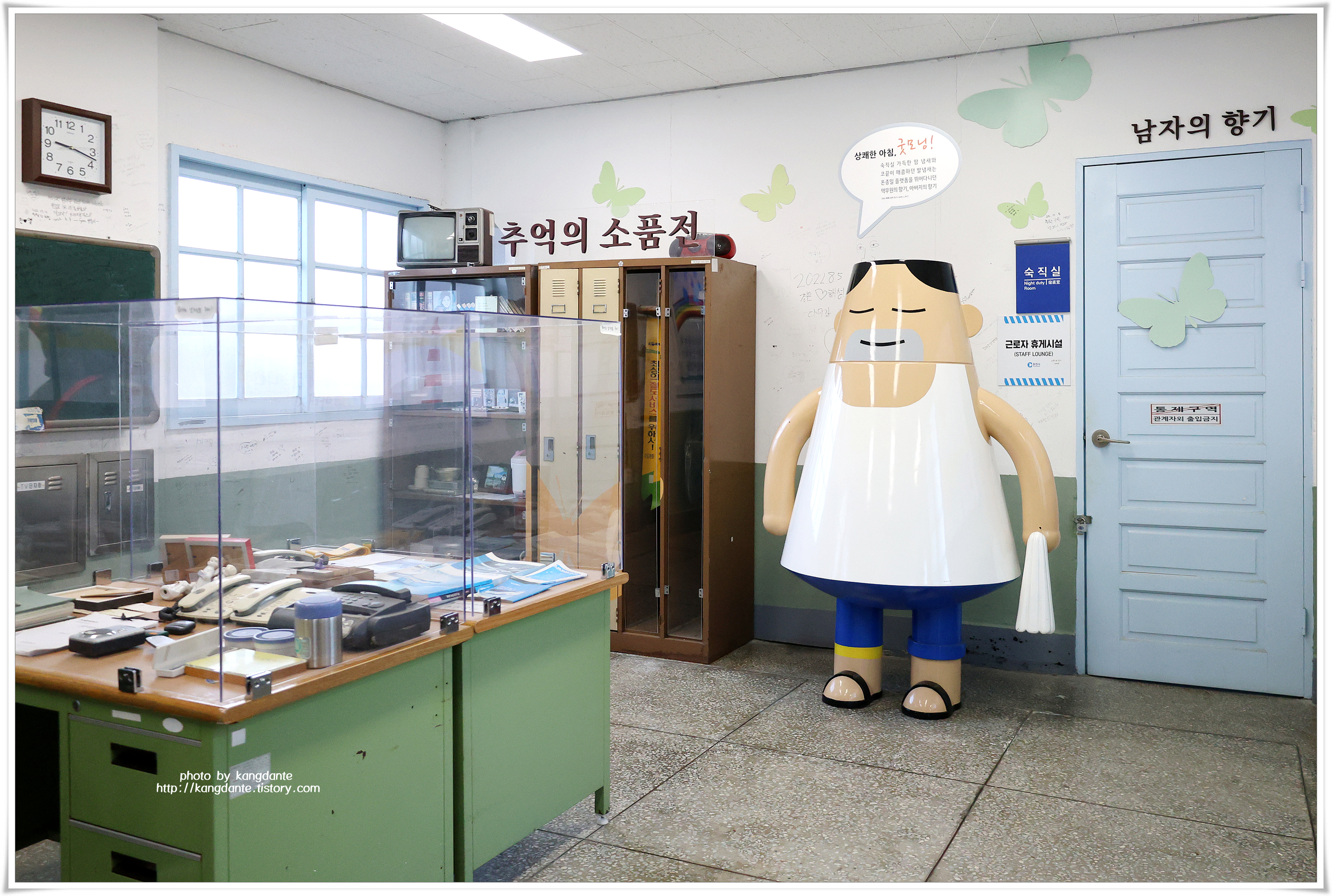 옛 김유정역에 들어서면 역사 입구에서 제일 먼저 환한 미소를 머금은 나신남 역장이 반기고 있으며, 이 조형물은 옛 신남역의 이름을 활용한 캐릭터라고 한다.